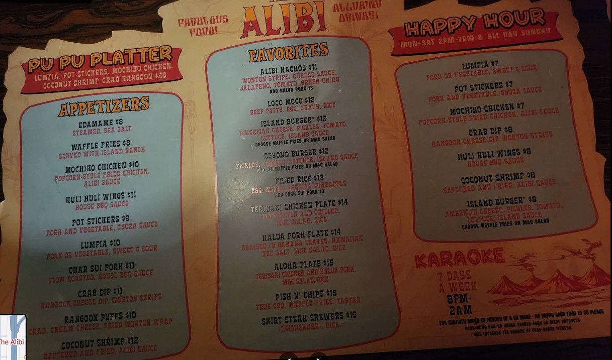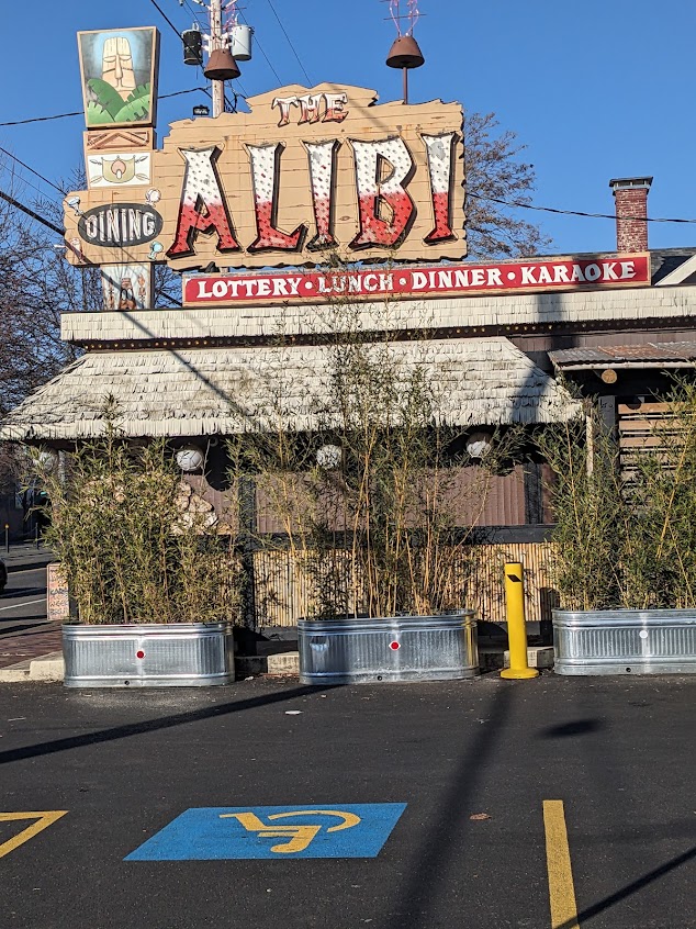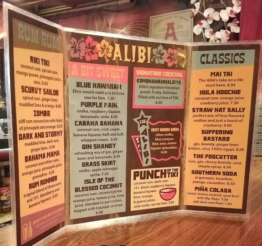 1947 Alibi Tiki bar, good vibes , great Atmosphere one of the top 10 Oldest Tiki Bars in the U.S. Karaoke 🎤 was pretty fun, I think new owners and looks like they added a cool outdoor smoking area, Mens bathroom could you a face-lift but was clean. They could add Smart led bulbs and some smoke to the water feature maybe to attract newish crowds and more flaming drink options.Would recommend. Had the Scorpion drink and was pretty spot on.