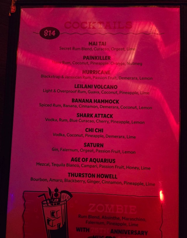 One of the highlights of our 2 week PNW trip. Loved the decor and theme. Great music playing while the bartender sang along under her breath. VHS playing Wayne's World. Dark lounge atomsphere with that perfect tiki feel to every surface. Clean and well maintained. Had some simple bites to eat, not one disappointed. We walked but Portland is easy to get around and this was just off the beaten path. A gem. Wife and I hope to come back someday.