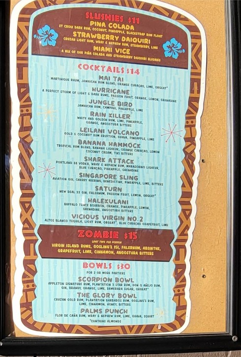 At The Alibi Tiki Lounge, we invite you to dive into a unique tropical experience right in the heart of Portland. Our menu is packed with exciting island-inspired cocktails, perfect for every taste. Whether you're here for a relaxing evening or a lively karaoke session, you'll find a welcoming atmosphere and delicious drinks to keep the energy high. Check out our full menu below to explore our signature cocktails, appetizers, and more, while enjoying the vibrant island murals and the unforgettable sounds of karaoke.